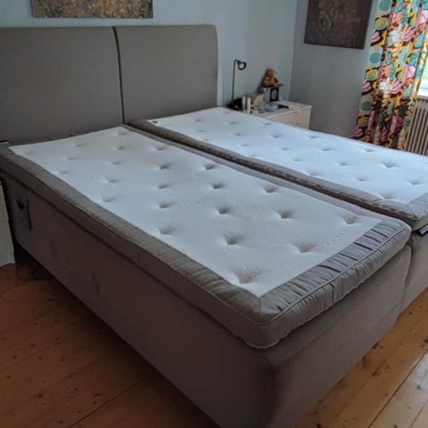 Mio kontinentalsäng i ljusgrått tyg. Sängen består av två underdelar med gemensam madrassdel ovanpå. Överkanten är utrustad med en tjock bäddmadrass i ljus färg. Sängen står på ben som ger utrymme under för städning eller förvaring. Skön att sova i.