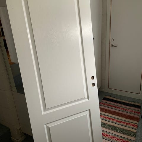 Vit spegeldörr med ytstruktur likt vitmålat trä. Dörren har en klassisk stil med rektangulära speglar och är avsedd för inomhusbruk. Dörrkarm ingår inte.