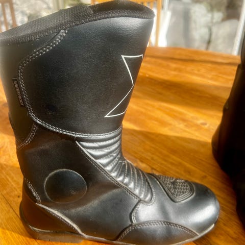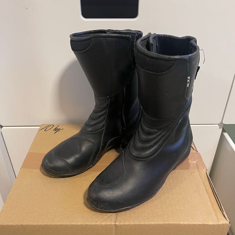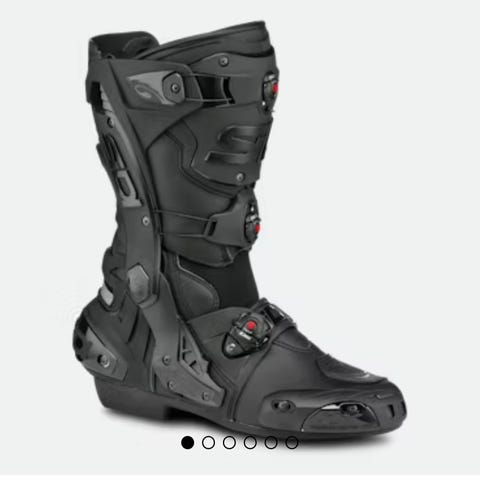 Sidi mc-stövlar i svart färg. Höga stövlar med förstärkningar vid häl, tå och sidor. Dragkedja på insidan av skaftet. Lämpliga som skyddande motorcykelstövlar vid landsvägs- eller banåkning. Materialet är slittåligt syntetiskt läder med hårda skyddspartier och utbytbara sliders vid tån. Storlek 44 små i storleken passar en som har 42-43
