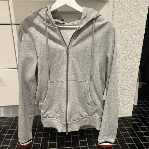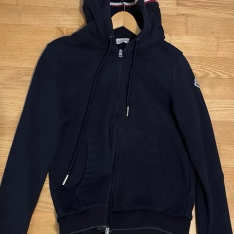 Moncler huvtröja för herr i storlek M. Tröjan är blå och tillverkad i bomull. Modellen har dragkedja framtill, huva med dragsko samt muddar vid ärmslut och nederkant. Fickor framtill Moncler-logotyp på ärmen.