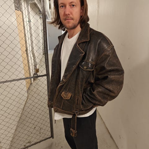 Snygg skinnjacka av märket SAKI-Sweden, perfekt till våren och sommaren! Jackan är i storlek 58 (jag bär XL på övriga jackor) har en tyghuva av hoodie-modell. Tre yttre fickor med dragkedja och tre innerfickor där en har dragkedja och en stängs med knapp.