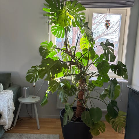 Monstera deliciosa krukväxt i grön färg. Växten har stora, flikiga blad. Passar som inomhusväxt i hem- eller kontorsmiljö och trivs bäst i ljust läge utan direkt stark sol. Behöver regelbunden vattning och omplantering vid behov när rötterna fyller krukan.