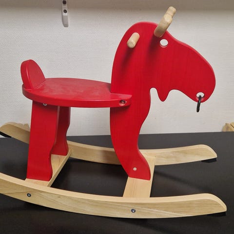 gunghäst i form av ett mjukdjur. Hästen är klädd i mjuk, brun textil med ljusa detaljer och har en sits med ryggstöd och säkerhetsbälte. Underredet är i trä med medar anpassade för gungning på golv inomhus.