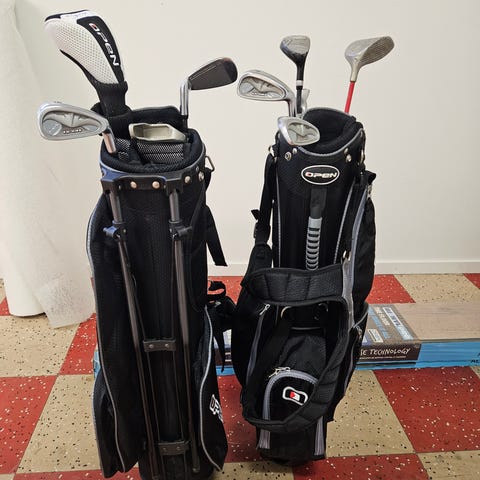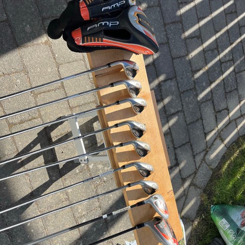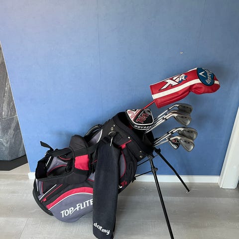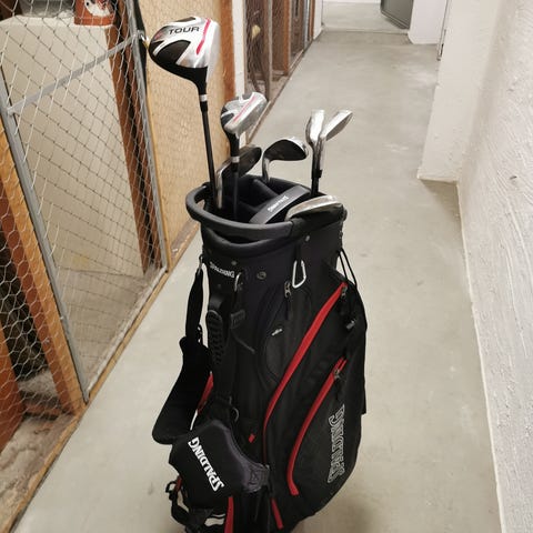 Spalding golfklubbor set med bag. Setet innehåller flera järnklubbor samt metalwoods/driver med Dunlop DP-1-huvuden. Klubborna har stålskaft respektive grafitskaft beroende på modell. Medföljer en golfbag i svart med vita detaljer och flera fickor för förvaring av bollar och tillbehör. Lämpligt som komplett set för spelare som söker ett färdigt paket med klubbor och bag.