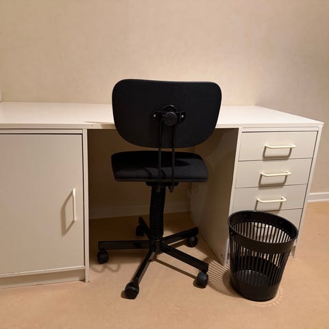 Skrivbord med rektangulär bordsskiva i grå färg och benställning i mörk färg. Tillhörande arbetsstol i grå plast med hjul och justerbar höjd. Passar som arbetsplats eller studiehörna i hemmet, exempelvis i sovrum eller kontor.