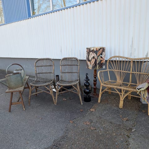 Vita fåtöljer i rotting med hög, rundad rygg och integrerade armstöd. Stolarna har flätad sits och dekorativt mönster i ryggen. Passar exempelvis i vardagsrum, uterum eller på altan under tak. Säljs som ett set med två matchande fåtöljer, eller separat. 300 kr st.
