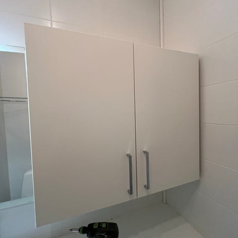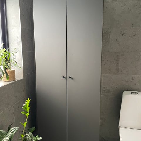 Högt badrumsskåp med två dörrar i vit färg. Skåpet är avsett för placering i badrum och ger förvaringsutrymme för till exempel hygienartiklar, handdukar och rengöringsprodukter. Enligt måttritningen är skåpet cirka 190 cm högt med flera hyllplan invändigt samt öppet utrymme i den nedre delen. Passar för montering mot vägg i standardbadrum där extra förvaring behövs.