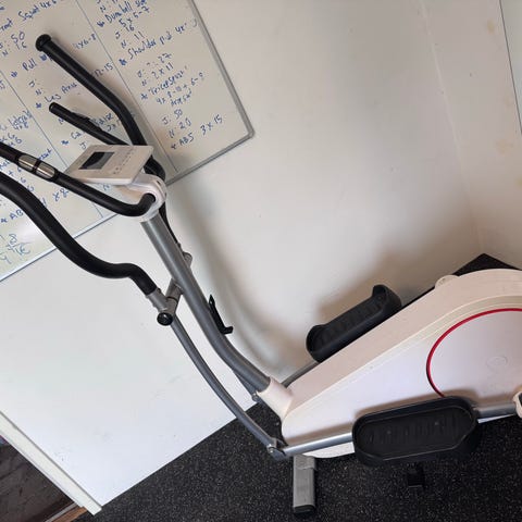 Benefit Sports 510 crosstrainer i grå färg. Träningsmaskin för konditionsträning inomhus med fotplattor och handtag för helkroppsträning. Passar för hemmabruk och kan användas för låg- till medelintensiv träning beroende på inställningar och användarens nivå.