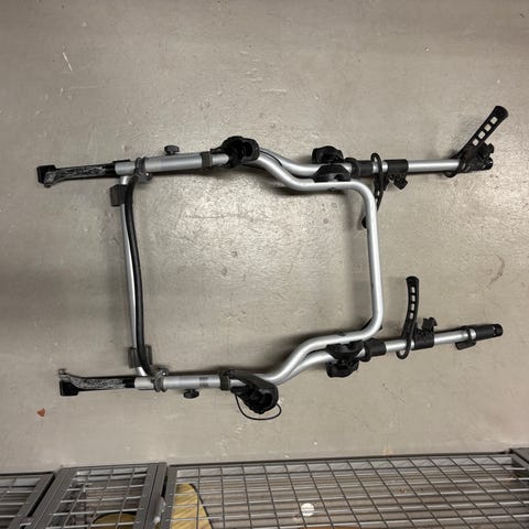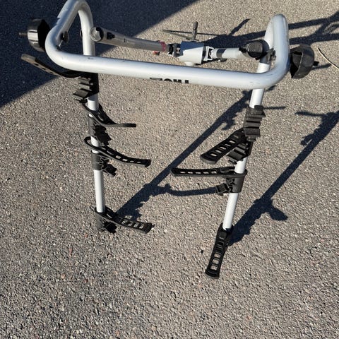 Cykelhållare för tre cyklar. För bilar utan dragkrok. Monteras på baklucka på kombi eller sedan. Saknar en gummitass, har ersatt den med skumgummi.