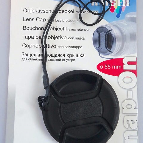 Levereras med snodd för att kunna fästas i kamerahus eller rem och minska risken att locket tappas bort.