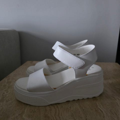 Din Sko sandaler för flicka i storlek 33. Modellen har vit ovandel med glittrande dekorationer framtill och justerbar rem runt ankeln. Sandalerna har en lätt vadderad innersula och platt yttersula som passar för vardagsbruk och festligare tillfällen under varmare väder. Innermått 20cm.