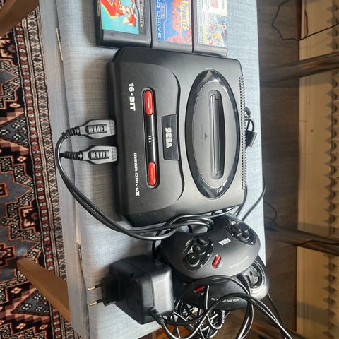 Sega Mega Drive spelkonsol i svart utförande. Klassisk 16-bitars konsol med cartridge-slot på ovansidan. På framsidan finns strömbrytare och reset-knapp. På bilderna syns även en handkontroll ansluten till konsolen. Passar för spel som är avsedda för Sega Mega Drive-systemet. Spelkonsolen innehåller över 100 inbyggda spel.