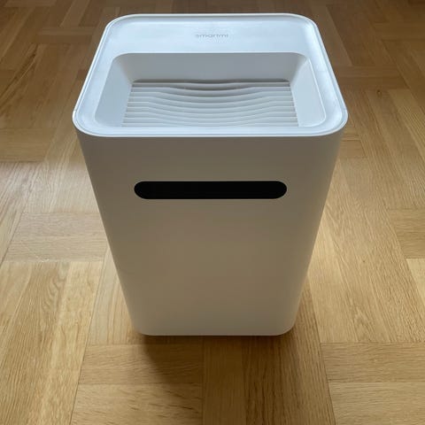 Luftrenare i grå färg med textilklädd utsida och plastdetaljer. Utrustad med bärhandtag i läder eller läderimitation för enkel förflyttning mellan rum. Passar för användning i exempelvis sovrum eller vardagsrum för filtrering av inomhusluft. Överkanten har flera nivåer med öppningar där luften tas in eller släpps ut, samt en panel upptill för styrning av funktioner.