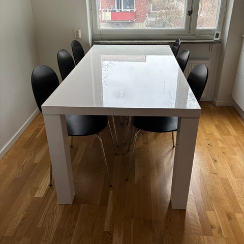 Ett vitt matbord ( dyrt vid inköp ) inkl 2st inläggs skivor brun och svart ! OBD fläckar av penna , tuschpennor osv , in enstaka hack !