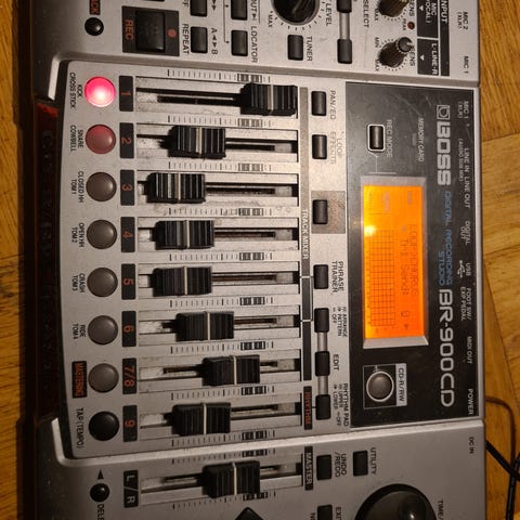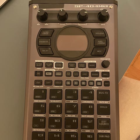 Roland SP-808 sampler med inbyggd mixer och sekvenseringsfunktioner. Enheten har flera reglar, knappar och pads för styrning av sampling, effekter och uppspelning. På baksidan finns olika in- och utgångar för anslutning av ljudkällor och inspelningsutrustning. Medföljer flera ZIP 100-diskar, inklusive Fujifilm ZIP-diskar, för lagring av ljud och projekt. Lämplig för musikproduktion och bearbetning av samplade ljud i studio- eller hemmamiljö.