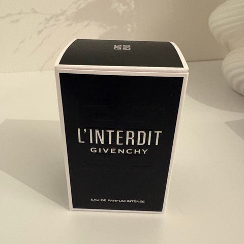 Givenchy L’Interdit eau de toilette. Doften kommer i originalflaska med tillhörande kartong, som visas på bilden.