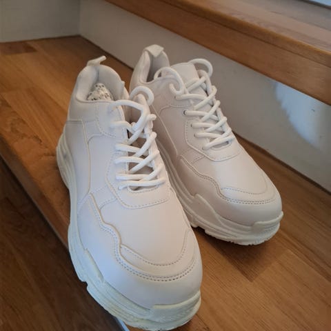 Zara sneakers i storlek 40. Modellen är vit med snörning och kraftigare sula. Ovandel i kombination av textil och syntetmaterial. Neutralt utseende som passar till vardagsbruk.