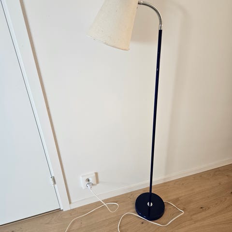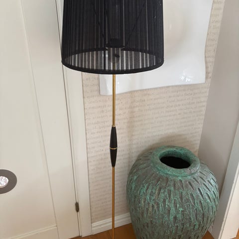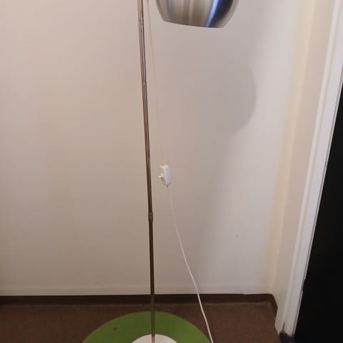 Kaxig 70-tals lampa. Ställbar samt höj- och sänkbar lampskärm. Höjd 130 cm. Hel och fin, fungerar. Svart/vit skärm. Finns att se på Kungsgärdet