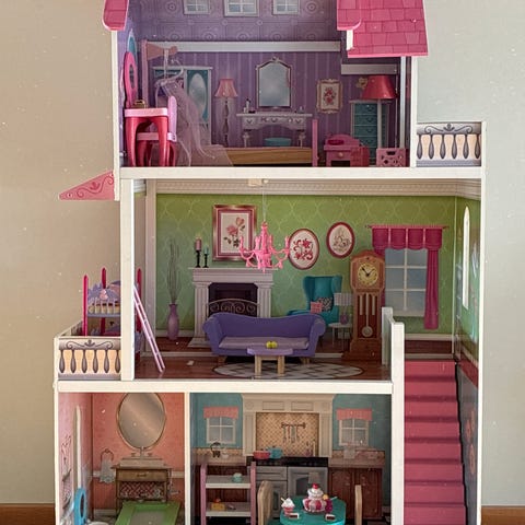 Stort dockskåp i flera våningar med flera rum, inklusive sovrum, vardagsrum, badrum och kök. Huset har tryckta inredningsdetaljer i rosa, svart och vitt samt öppna sidor för lek. Passar för Barbiedockor och liknande dockor i liknande storlek.