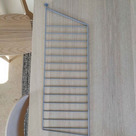 String hyllsystem med skåp i vit färg, formgivet av Nils Strinning. Systemet består av väggmonterade gavlar, hyllplan och underskåp med lådor, vilket ger förvaringsmöjligheter både öppet och dolt. Passar för förvaring och exponering av böcker, porslin, dekorationer eller mediautrustning i vardagsrum, sovrum eller arbetsrum.