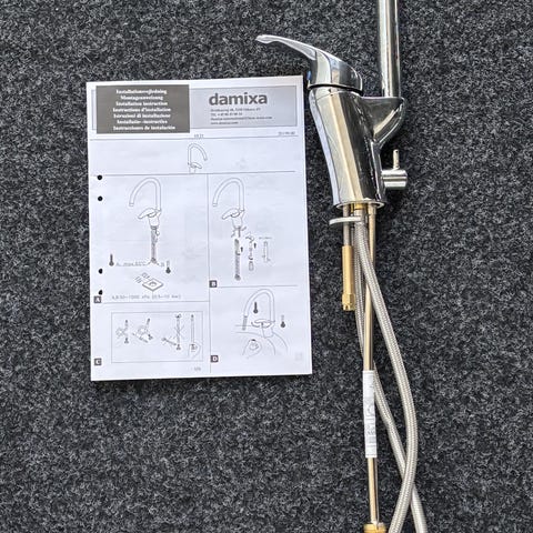 Köksblandare i kromfärg med hög, svängd pip. Levereras med monteringsdetaljer enligt bild och installationsanvisning. Passar för montering i kök eller tvättstuga där en hög pip önskas för att underlätta disk och hantering av större kärl.