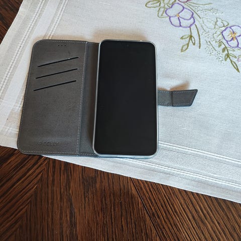 Samsung Galaxy S22 smartphone med 128 GB internminne. Väldigt lite använd . På bilderna syns även ett svart plånboksfodral och ett svart skal som är anpassade för modellen. Telefonen har trippelkamera på baksidan och pekskärm på framsidan.