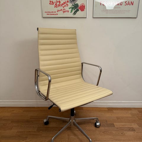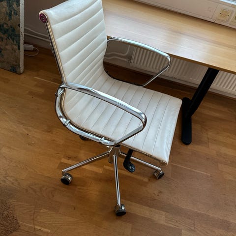 Kontorsstol i Eames-stil med vit klädsel och stomme i krom. Stolen har hjul och justerbar höjd samt tiltfunktion.