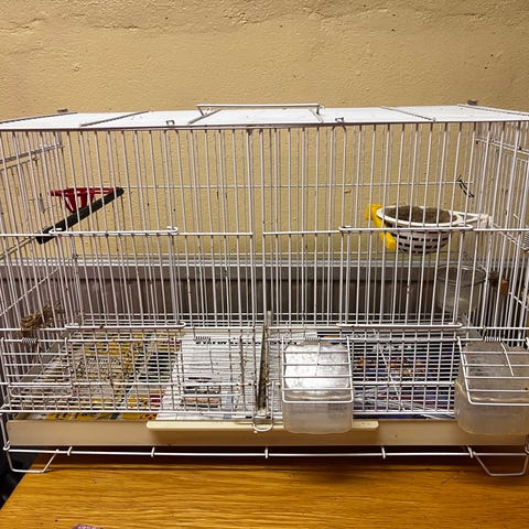 Inredd bur till fåglar, ingår en del saker såsom rep och ställningar, samt en avdelare - ett golv.