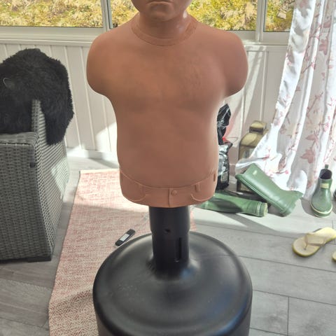 Fristående slagdocka/boxningsdocka i mänsklig överkroppsform. Dockan är röd och monterad på en svart fot som kan fyllas för ökad stabilitet. Lämplig för träning av slag- och sparkteknik inom boxning, kampsport och fysträning. Höjden är justerbar via fjäder-/stolpdel mellan docka och fot. Tillverkad i slitstark plast/gummi-liknande material avsett för upprepad träffträning.