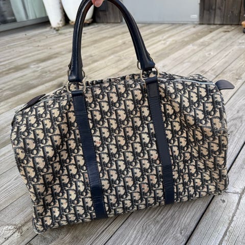Beige canvas, bruna skinndetaljer, mässlingfärgade beslag