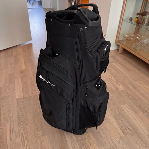 Maggo golfbag i svart färg. Bagen har flera ytterfickor med dragkedja för förvaring av tillbehör. Regnskydd ingår och går att knäppa av. Vagnbag.