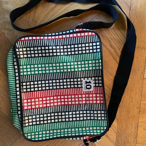 Säljer 2st datorväska med gröna kanter och axelrem. Väskan har ett färgglatt tryck i hörnet och en praktisk, rektangulär form. Perfekt för att bära laptop och tillbehör. Materialet är troligtvis syntetiskt tyg.och ett datorfodral