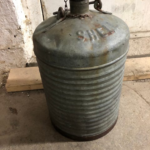 Insidan belagd med tenn. Plastburk i spannen för att skydda den om man har vatten i den.