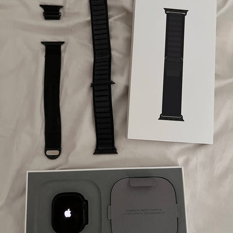 Apple smartklocka med svart armband. Klockhuset har rektangulär form med rundad skärm och sensorer på baksidan. Armbandet är i svart färg och kan tas av och sättas på klockan. Produkten är avsedd att användas som smartklocka tillsammans med kompatibel Apple-enhet och har utbytbara armband via standardiserade fästen för Apple Watch.