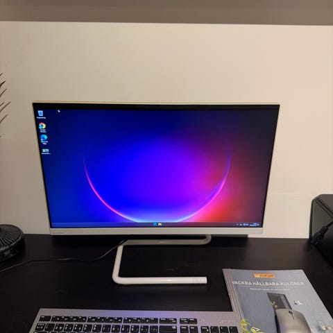 Full HD HP bildskärm med skärmstorlek på 23 tum. Skärmen är monterad på bordsstativ med möjlighet att dra igenom kablarna så det blir snyggt och prydligt. Skärmen går att vrida upprätt 90 grader samt tilta upp och ner ett antal grader för bästa betraktningsvinkel. Passar för kontorsarbete, studier och allmän datoranvändning.