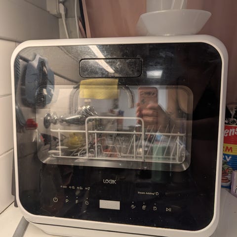 Bosch bänkdiskmaskin i vit färg. Fristående modell som placeras på bänk. Maskinen har frontpanel med vred för programval och flera funktionsknappar. Invändigt finns korg för tallrikar, glas och bestick samt separat bestickkorg. Passar för mindre kök eller där det inte finns plats för inbyggd diskmaskin.