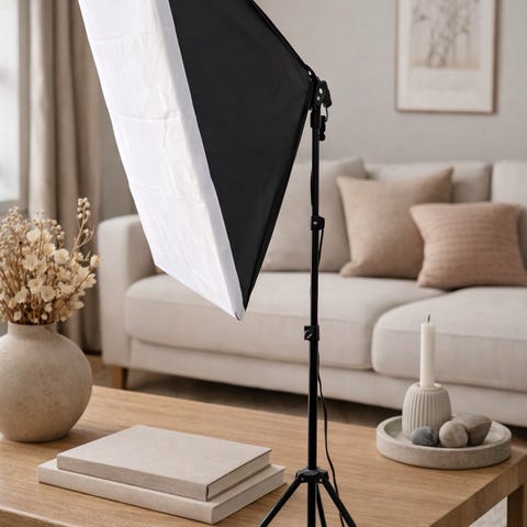 Raleno softbox-belysningskit för foto och video. Kitet innehåller två softboxar med tillhörande lampor, två justerbara stativ samt en transportväska. Passar för studiofotografering, produktfoto, porträtt och videoinspelning där jämnt och mjukt ljus önskas. Strömkablar är integrerade i softboxarna för anslutning till vägguttag.