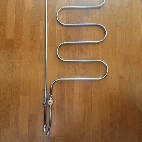 Handdukstork i kromad metall för väggmontering. Modellen har flera horisontella rör för upphängning och torkning av handdukar i badrum. Passar för montering på kaklad vägg. Lämplig för användning i badrum eller tvättutrymme för att hålla handdukar torra och organiserade.