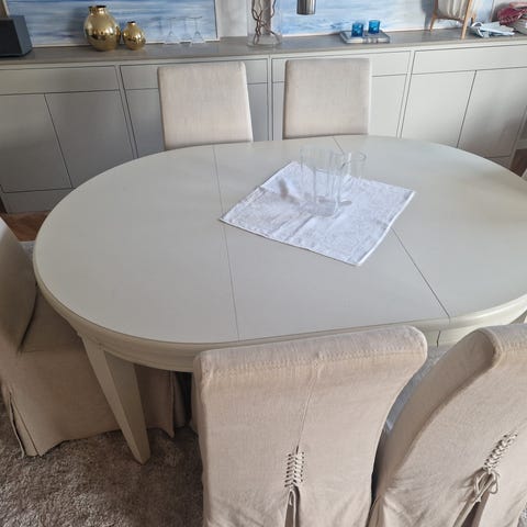 Grundmålat med primer i två omgångar + två omgångar med den mintgröna färgen. Då jag brutit färgen själv så har jag tyvärr ingen färgkod, men den färg som är över kan fås med. Bordet är massivt, stabilt och i mycket fint skick.