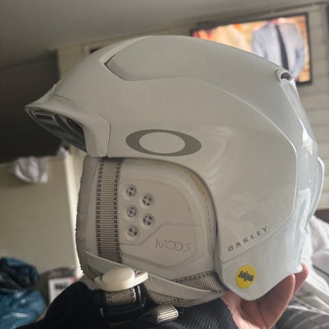 Oakley Mod1 hjälm för junior i storlek small, 49–53 cm. Hjälmen är svart med matt yta och har justerbart hakspänne. Invändigt finns vaddering och meshpaneler för komfort. Avsedd för yngre användare, lämplig för exempelvis skidåkning eller snowboardåkning där hjälmskydd behövs.