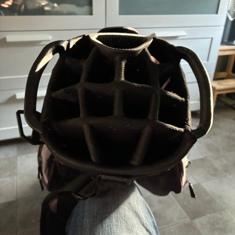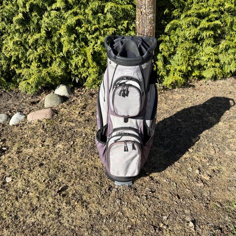 Ping golfbag vagnbag i svart och grått tygmaterial. Bagen har flera separata fack för klubbor i toppen samt flera ytterfickor med dragkedja för tillbehör. Bärhandtag och vadderad rem på baksidan för enklare hantering. Avsedd att användas som vagnbag på golfvagn eller golfbil.