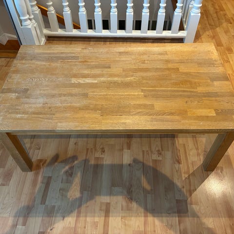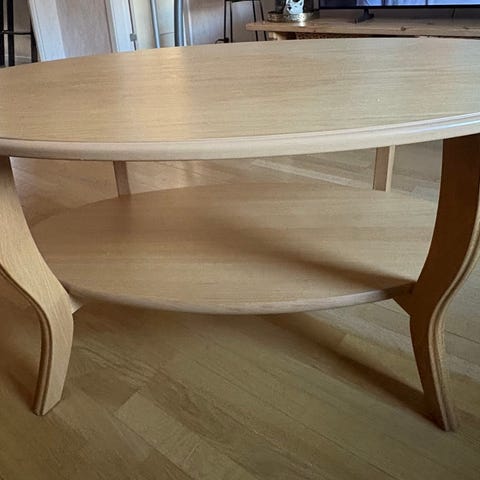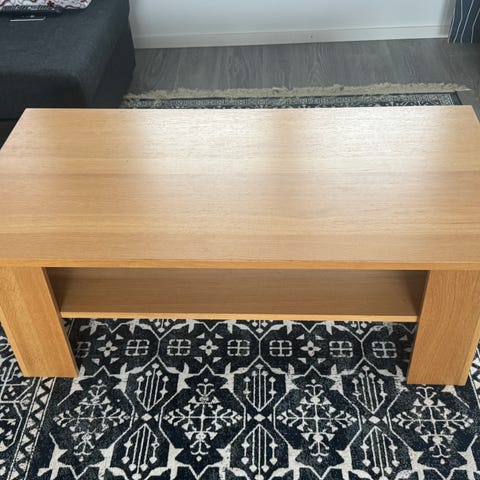 Rektangulärt soffbord i ljusbrunt trä. Bordet har rak bordsskiva med synlig träådring och fyra raka ben placerade i hörnen. Passar som soffbord i vardagsrum eller som mindre avlastningsbord.