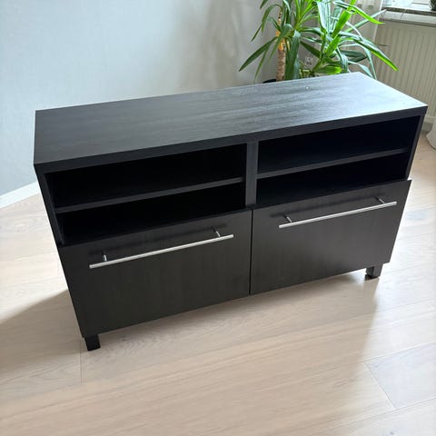 Tv-bänk byggt ifrån ikea köksstomme, inklädd i täckskivor. 2 skåp med hyllplan i.