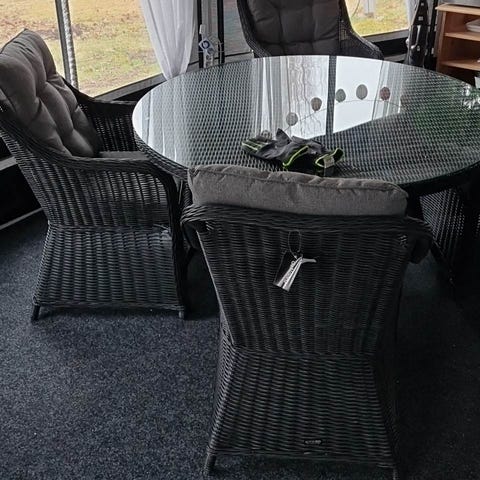 Hörnsoffa med bord utemöbelset i konstrotting med grå dynor. Setet består av en hörnsoffa med flera sittplatser och högryggade ryggkuddar samt ett rektangulärt bord med glasskiva. Soffan har grå stoppade sitt- och ryggdynor och stommen är i flätad rottinglook. Bordet har ben i samma rottingmaterial och en plan glasskiva ovanpå. Passar för uteplats, altan eller inglasat uterum som sitt- och matgrupp.