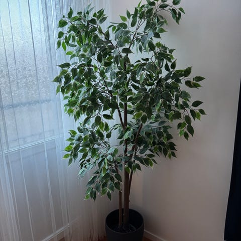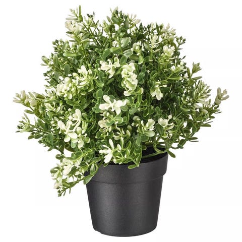 IKEA konstgjord växt i kruka i gröna nyanser. Växten står i en enkel svart plastkruka och har höga stjälkar med stora blad. Passar som dekorationsväxt inomhus i exempelvis vardagsrum, hall eller kontor. Kräver ingen skötsel förutom eventuell avtorkning av damm på bladen.