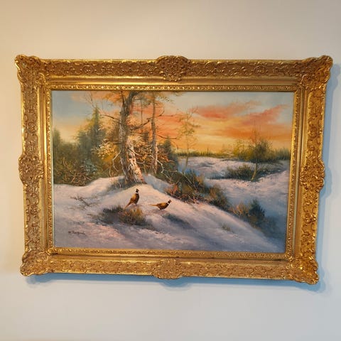Antik tavla oljemålning - landskapsmotiv i vacker guldram