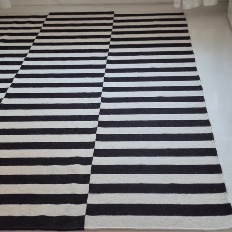 Klassisk IKEA Stockholm ullmatta i randigt mönster i färgerna svart och offwhite.