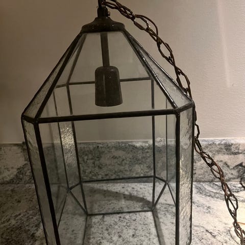 Taklampa med stomme i mässing och glaspaneler med rombmönster. Toppen är i ljusgrön metall. Lampan har en kedja för upphängning och en takkopp i mässing. Total höjd med kedja och takkopp är 80 cm. Själva lampdelen är 20 cm hög och 15 cm bred.