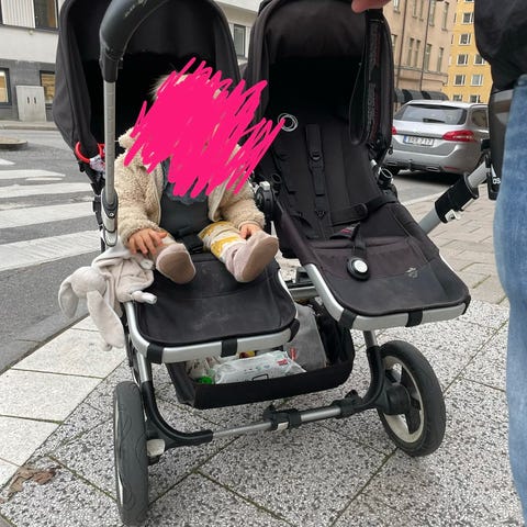Bugaboo Donkey syskonvagn/dubbelvagn i grå textil. Vagnen har två sittdelar bredvid varandra med individuella justerbara ryggstöd, fempunktsbälten och fotstöd. Chassit har svängbara framhjul och större bakhjul samt varukorg under vagnen. På bilderna syns även tillbehör som matchande varukorgsväskor och förvaringsdelar. Vissa delar av skumhandtag och klädsel visar tecken på slitage enligt bilderna. Passar för två barn i sittålder.
