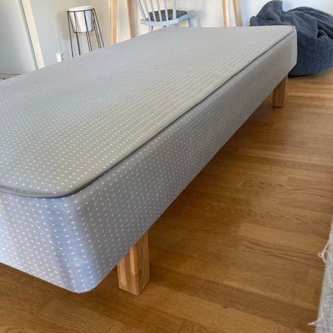 Hästens säng klädd i klassiskt blåvitt rutigt tyg. Sängen består av resårbotten med matchande bäddmadrass. Passar som enkelsäng i sovrum, gästrum eller tonårsrum. Träram med ben och textilklädsel runt om. Rutigt överdrag på bäddmadrassen som kan tas av vid behov. Neutral design som fungerar i olika typer av inredningar.